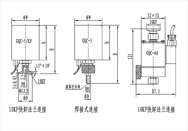 GQC-1.5 GQC-5 electromagnetic high vacuum filling valve is driven by electromagnetic force. When the power supply is switched on, the valve is closed to isolate the vacuum system from the atmosphere. When the power supply is cut off, the valve is in an open state, and then the atmosphere is introduced into the vacuum system from the outside. Model GQC-4A electromagnetic high vacuum inflatable valve has two functions: power-on opening and power-off. The valve has air filter inside and can be used to inflate the vacuum system.
